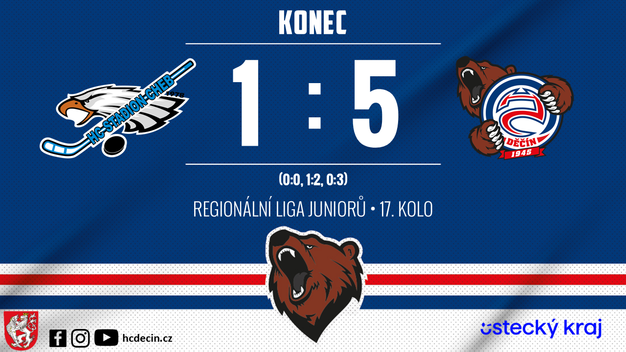 Juniorský tým Medvědů potvrdil vynikající formu a v rámci 17. kola Regionální ligy juniorů zvítězil na ledě Chebu přesvědčivě 5:1. Pro Děčín to byla už třetí výhra v řadě. Hráči znovu ukázali týmový výkon podpořený skvělou produktivitou i poctivou obranou.