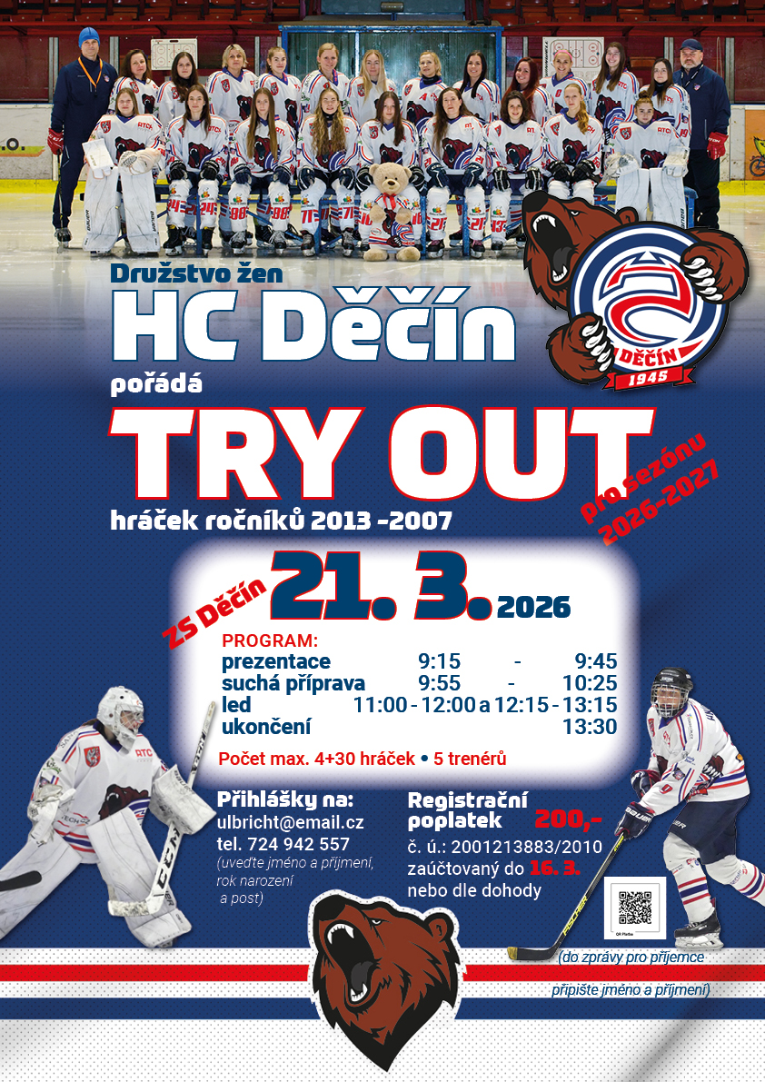 Družstvo žen HC Děčín vyhlašuje try out před sezónou 2026/2027 a dává příležitost hokejistkám ročníků narození 2007–2013 zabojovat o místo v týmu děčínských Medvědic. Try out se uskuteční v sobotu 21. března 2026 na zimním stadionu v Děčíně a nabídne komplexní tréninkový program pod vedením trenérského týmu.
