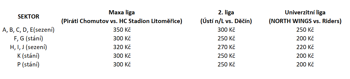 Prodej probíhá výhradně online prostřednictvím aplikace klubu Piráti Chomutov od 1. října 2025 do vyčerpání kapacity. U utkání Piráti Chomutov vs. HC Stadion Litoměřice mají majitelé permanentek obou klubů přednostní právo nákupu do 18. října 2025. Vstupenky na druholigové derby a duel Univerzitní ligy jsou dostupné ihned pro veřejnost.