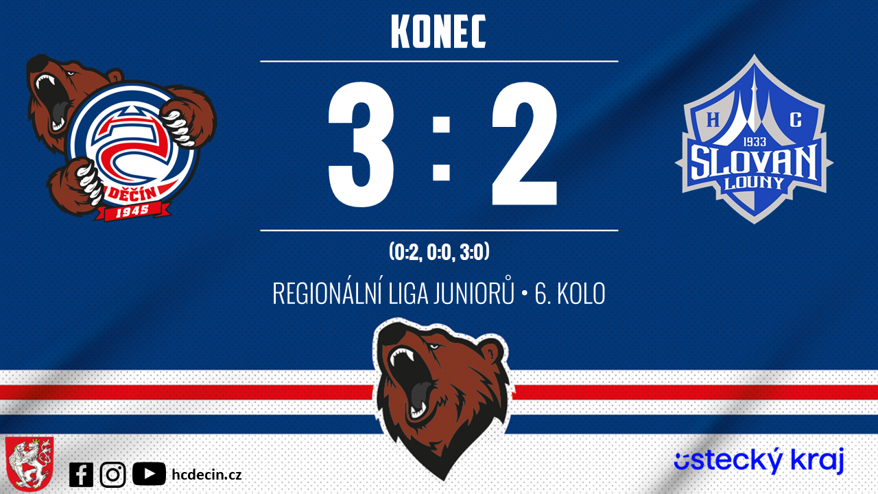 Medvědí juniorka předvedla v domácím utkání parádní obrat a po skvělém třetím dějství nakonec slavila vítězství 3:2 nad Louny. Zatímco po první třetině ztráceli Děčínští dvě branky, nakonec dokázali výsledek otočit a připsali si vybojované tři body.