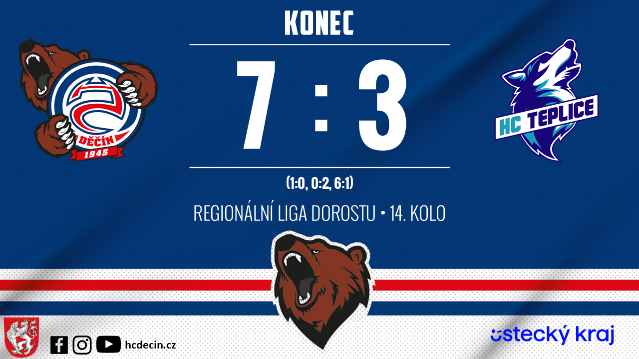 V rámci 14. kola Regionální ligy dorostu přivítal Děčín na domácím ledě HC Teplice. Utkání přineslo třetiny jako den a noc – po matnější prostřední části museli mladí Medvědi zabrat a skvělou poslední dvacetiminutovkou dokonali obrat, který táhl Matěj Měřička. Po zápasové pauze se tak vrátili na vítěznou vlnu a zaslouženě zvítězili 7:3.